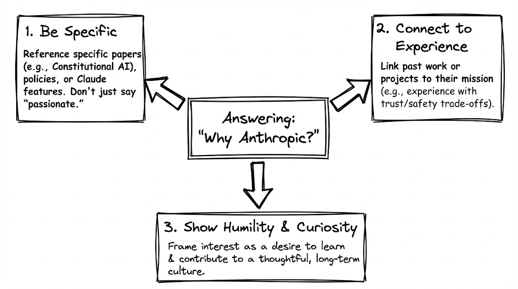 - Be Specific: Go beyond saying you’re “passionate about AI.” As recommended by guides on InterviewQuery, reference a specific Anthropic research paper (like their work on Constitutional AI), a policy document (like the Responsible Scaling Policy), or a feature of Claude that you find compelling.