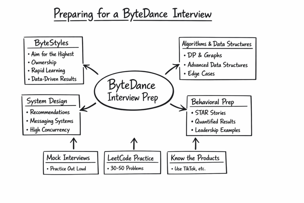 Self-study is an essential first step. Start with the frameworks and example answers provided in section 1 of this guide. Use free resources like LeetCode, HackerRank, CodeSignal, and ByteDance’s official interview preparation materials.