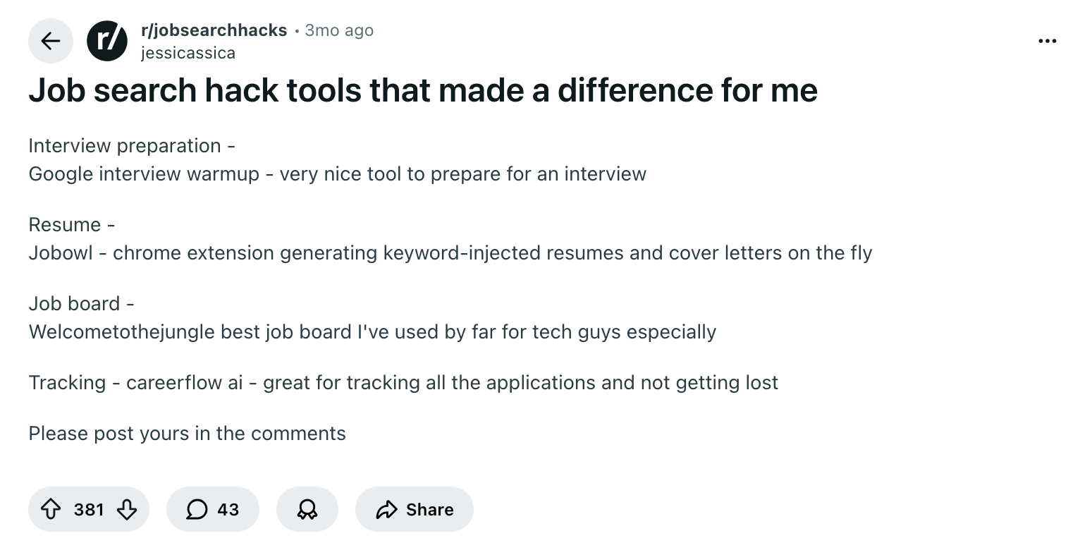 This user highlights Careerflow mainly for its Job Tracker, suggesting that the organization features are what stood out most for them. It’s mentioned alongside other job search tools, implying that Careerflow may work best as part of a broader workflow.
