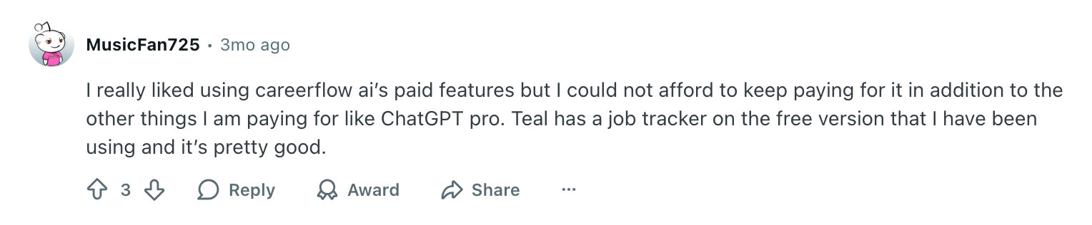 In this case, the user had a positive experience with Careerflow’s paid features but felt the ongoing cost wasn’t sustainable alongside other subscriptions. We’ll look more closely at Careerflow’s pricing in the next section.