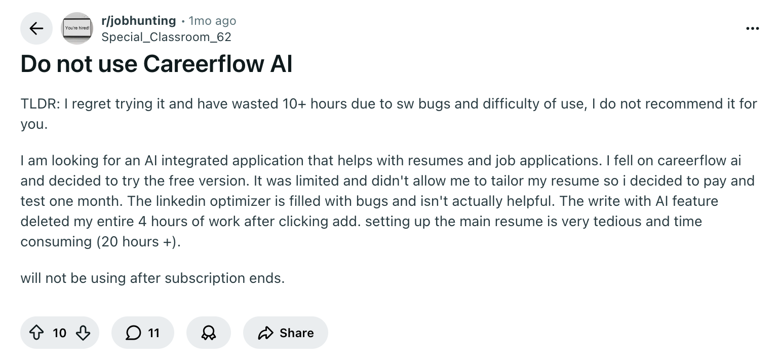 A more critical experience appears here. The reviewer reports bugs, lost work, and a lengthy setup process. This highlights a key consideration: while Careerflow offers many tools, their usability and stability may vary.