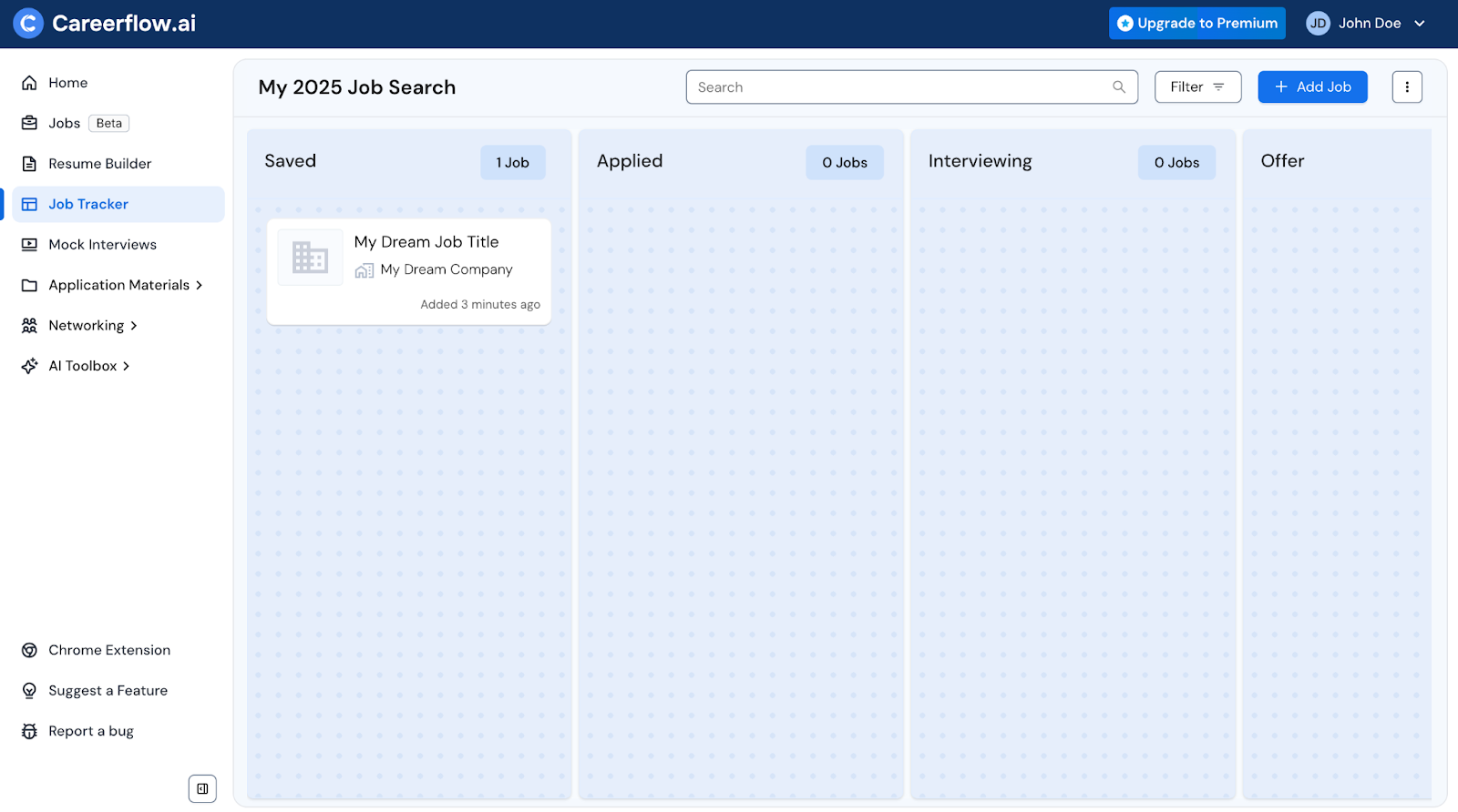 After that, you can add a job you want to target. This can be done by manually entering the job details into the Job Tracker or using the Chrome extension to pull listings from other sites. There’s also a built-in job board, but it’s currently in beta.