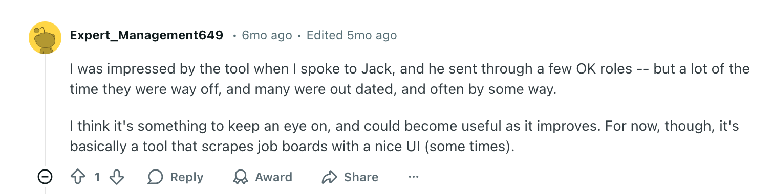 This user liked the concept but wasn’t happy with inaccurate and outdated listings. This suggests the platform still faces accuracy and reliability challenges despite its promising AI-driven approach.