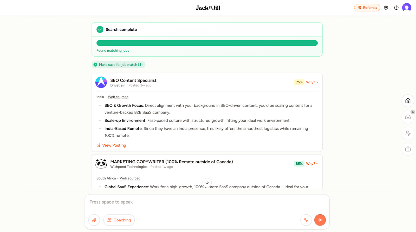 Jack & Jill stands out for its conversational interface, which makes the job search feel simple and intuitive. You can ask for very specific roles, and it is completely free for job seekers.