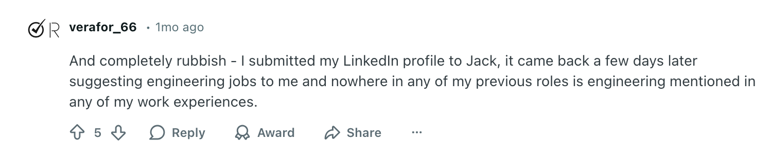 This review points to a serious personalization issue. Recommending engineering roles to someone in an entirely different field raises concerns about how effectively the chatbot interprets profiles and matches candidates to suitable jobs. Although, as the previous review said, we hope this can be improved in the future.