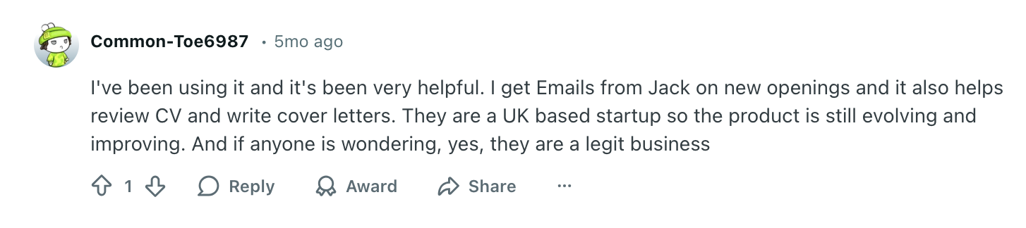 Here, the experience is largely positive. The user highlights helpful email alerts, CV reviews, and cover letter support. While they note it is still evolving, they confirm it is legitimate and actively improving as a startup.