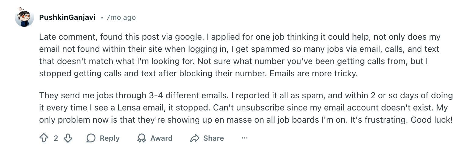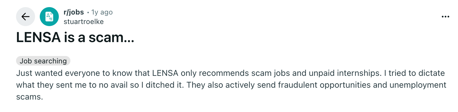 Here, the reviewer claims Lensa repeatedly sent unpaid or potentially fraudulent listings, with no way to improve the recommendations. Their experience suggests major concerns about the quality and safety of some job alerts.