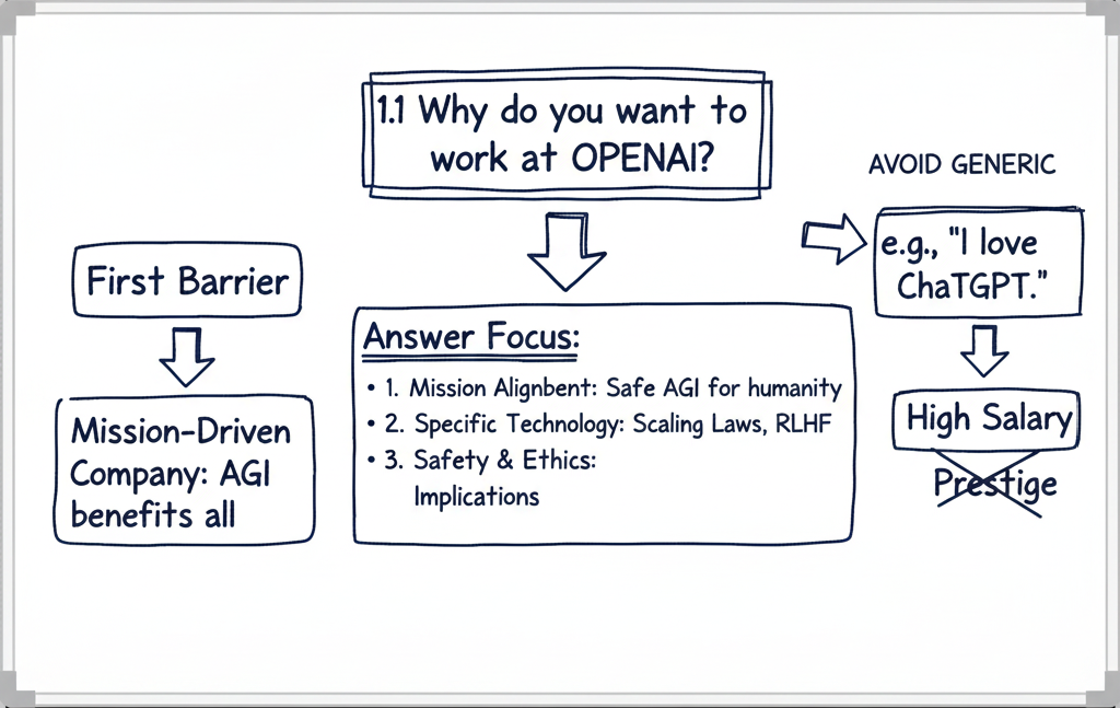 This is the very first barrier. OpenAI is a mission-driven company dedicated to ensuring AGI benefits all of humanity. Interviewers need to know you are aligned with this specific goal, not just looking for a high salary or prestige.