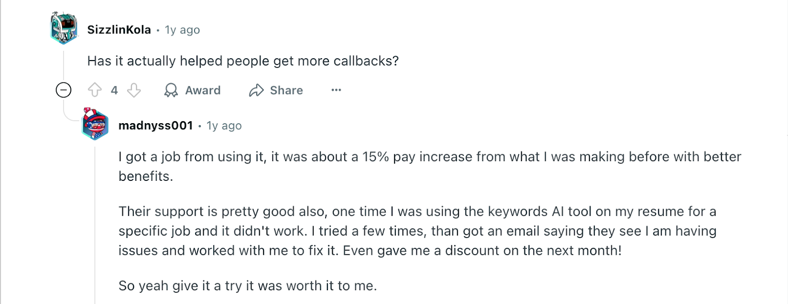 A Redditor shared that Simplify Copilot helped them secure a job with a 15% raise and better benefits. They also described responsive support when they faced a resume keyword issue. This review suggests the tool can deliver tangible results along with decent customer service.