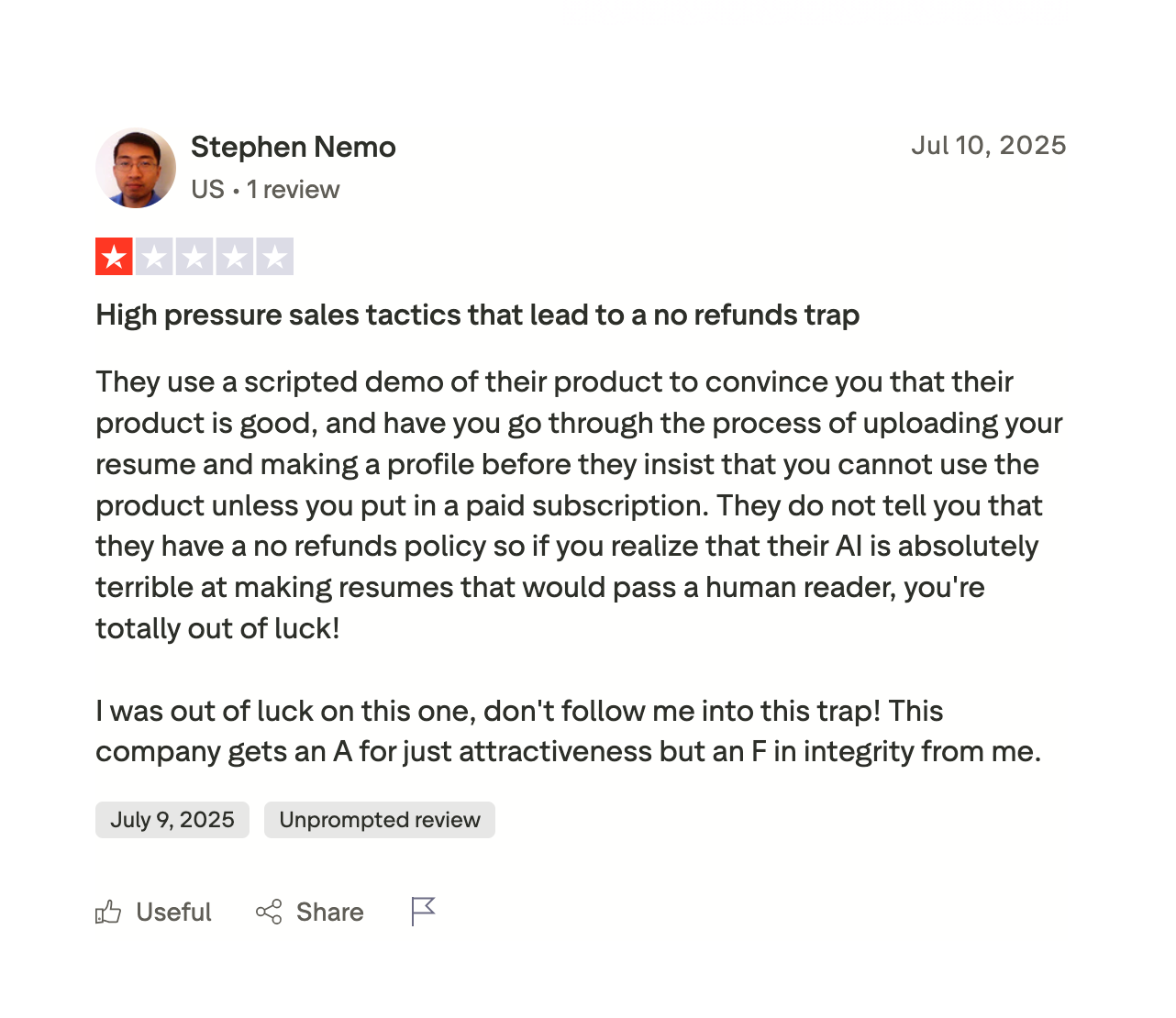 Not all experiences are positive. This Trustpilot user was critical, citing pressure to pay, a no-refund policy, and weak AI resume quality. It’s a reminder that results can vary, and some users may find the premium features less useful than expected.