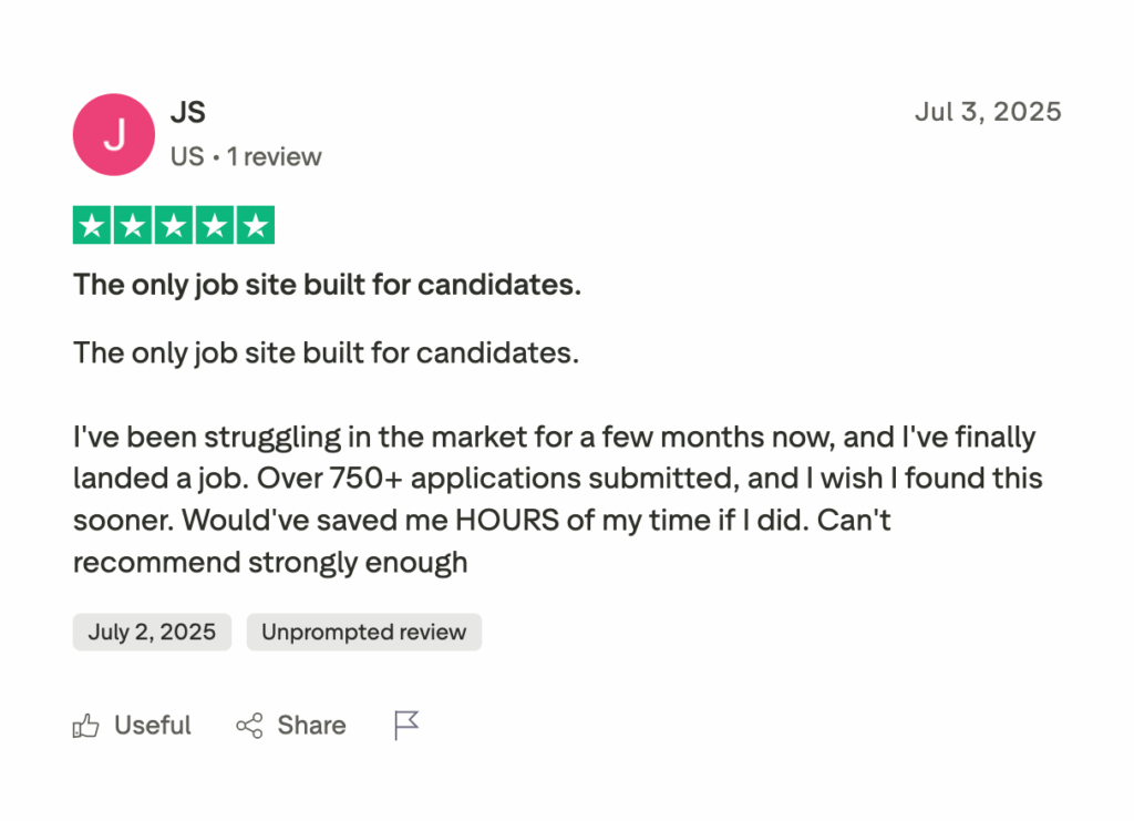 One Trustpilot reviewer gave Simplify Copilot five stars, calling it “the only job site built for candidates.” After submitting over 750 applications and finally landing a job, they noted they wished they had discovered the tool sooner in their search.