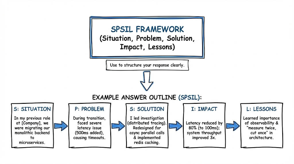 Use the SPSIL framework (Situation, Problem, Solution, Impact, Lessons) to structure your response clearly.