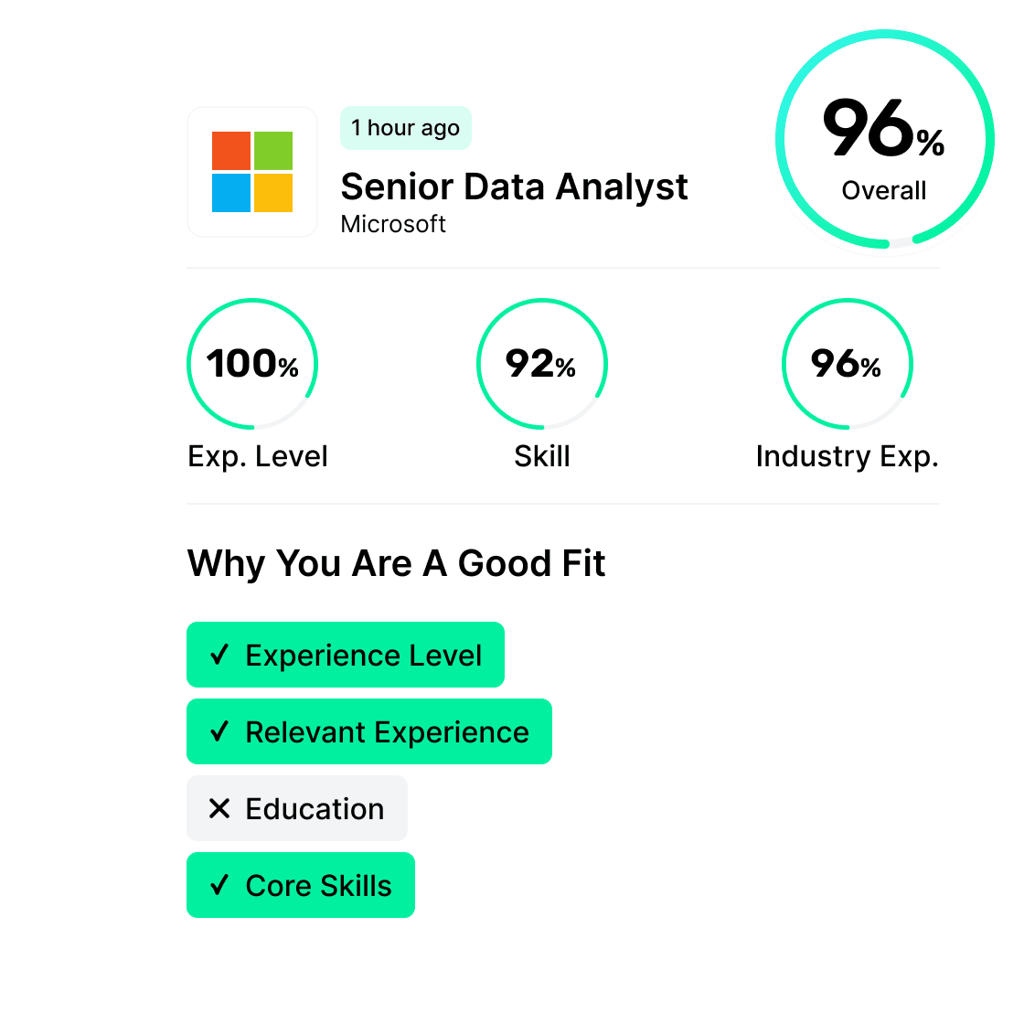 Thanks to this platform I've landed a few interviews and accepted an offer within 1 week of interviewing!! It helped me cut through the noise in the job search on Linkedin and the AI helped me learn why I'm a good fit for each role.